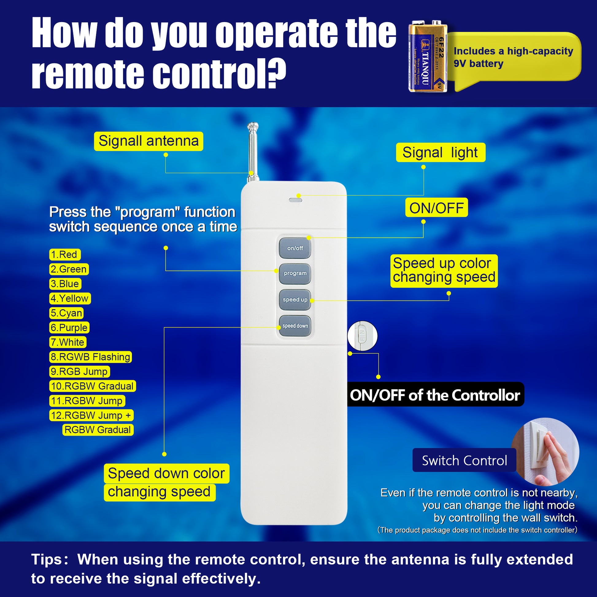 - Control your pool's ambiance with ease using our Led Pool Light Bulb equipped with 2 signal receivers and a remote control powered by a 9V battery. A new antenna design enhances remote reception, extending control up to 66 ft (underwater up to 3.3 ft) for stable operation. Additionally, you can change the pool light color using the wall switch if the remote isn't handy.